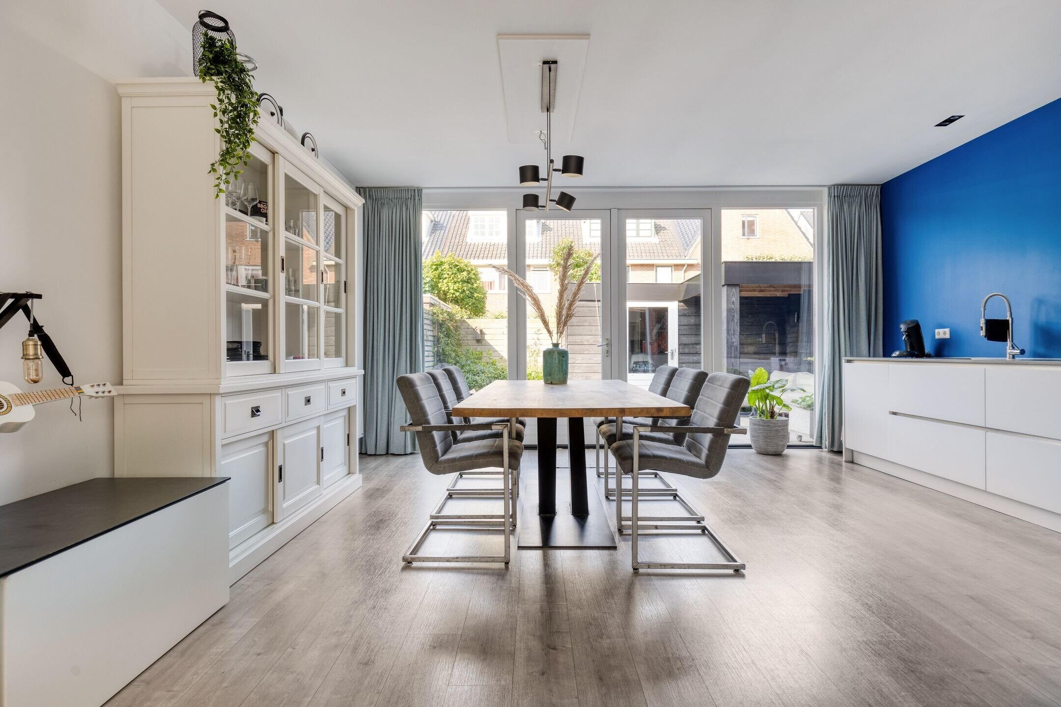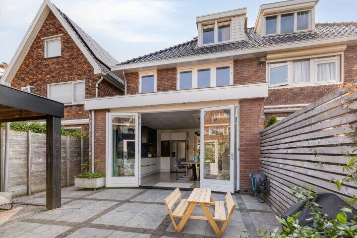 Via de voordeur betreed je de lichte entree met vernieuwde meterkast en moderne toiletruimte met hangend toilet en wastafel, waarna je doorloopt naar de sfeervolle woonkamer. Hier springt de prachtige erker direct in het oog, voorzien van originele glas-in-lood ramen die zorgen voor een fijne lichtinval en een authentieke sfeer. De woonkamer beschikt nog over de authentieke en-suite deuren met glas-in-lood panelen, waarmee je de woon- en eetkamer stijlvol van elkaar kunt scheiden. Deze klassieke elementen geven het huis nog charme die je van een jaren ’30 mag verwachten. Loop je verder, dan stap je de royale, uitgebouwde leefkeuken binnen. Deze moderne keuken is uitgerust met alle gemakken, zoals een afwasmachine, stoomoven, koel-/vriescombinatie, 5-pits inductiekookplaat, een RVS afzuigkap, vrijstaande magnetron en een mengkraan met uittrekbare uitloop. Dankzij de uitbouw aan de achterzijde is hier een heerlijke, lichte ruimte ontstaan waar koken, eten en samen zijn centraal staan. De dubbele openslaande deuren verbinden de keuken direct met de zonnige achtertuin, waardoor binnen en buiten moeiteloos in elkaar overlopen.