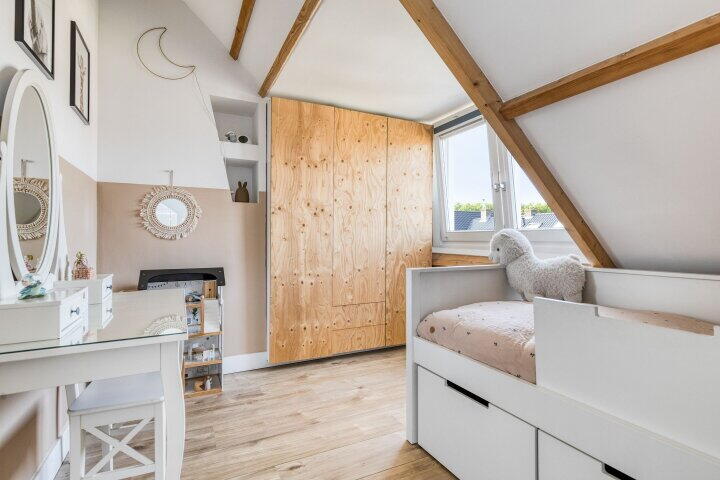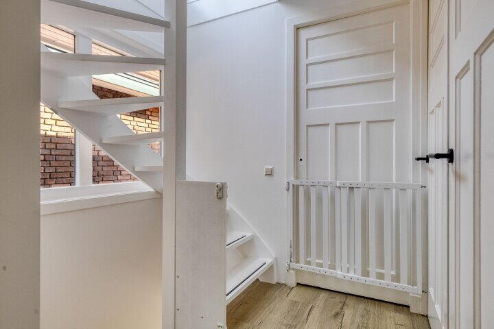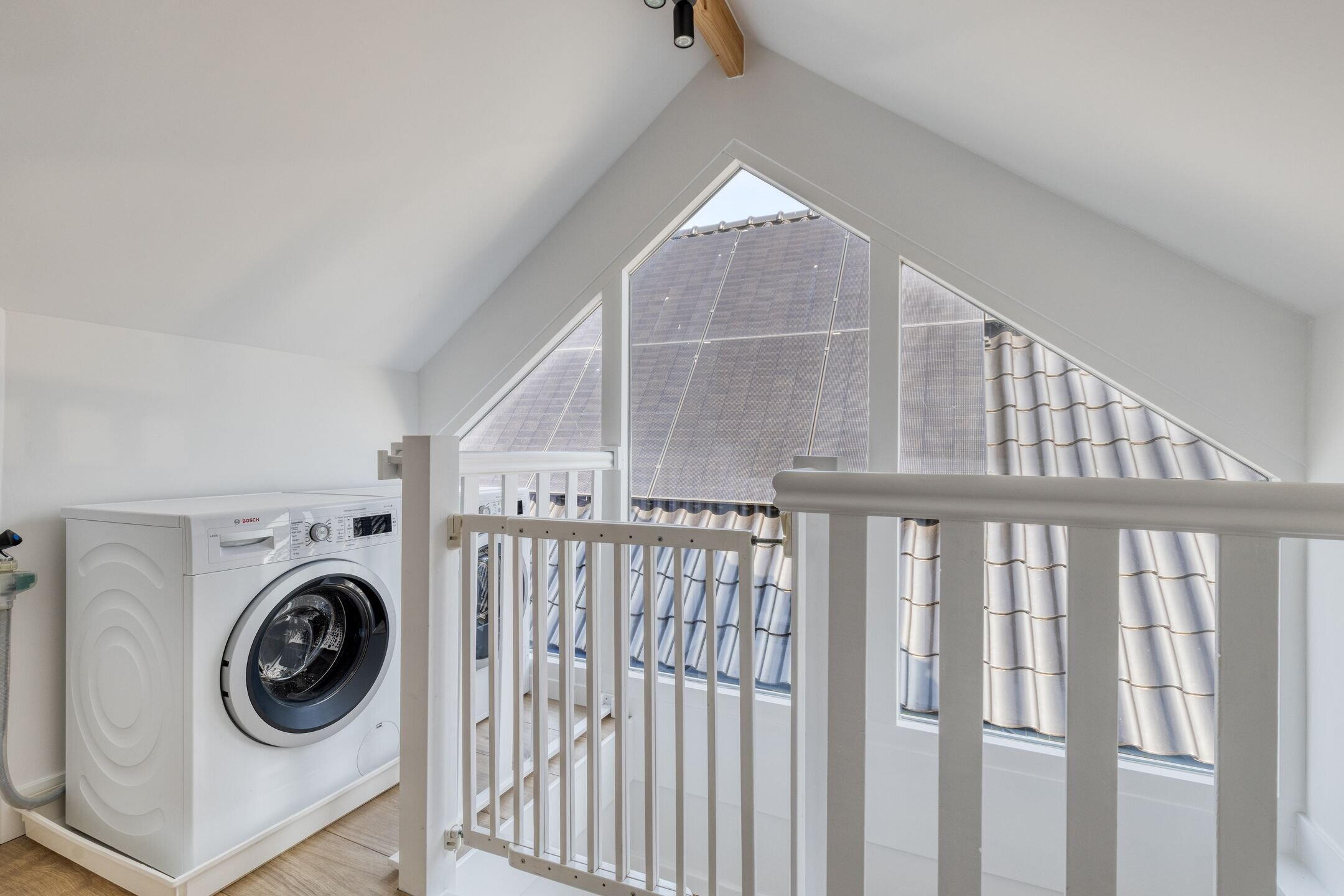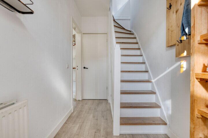 The renewed staircase leads to the surprisingly spacious second floor, also equipped with comfortable floor insulation and electric underfloor heating. The large dormer with a continuous skylight in the side wall lets in plenty of natural light. Here you’ll find two generous bedrooms, with the rear room being extra spacious thanks to the large dormer. The laundry area is located on the spacious landing, and the central heating installation can be found in the closet in the front bedroom.