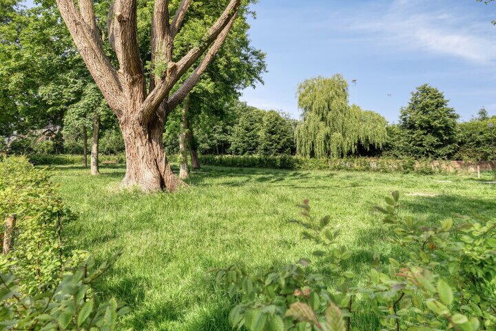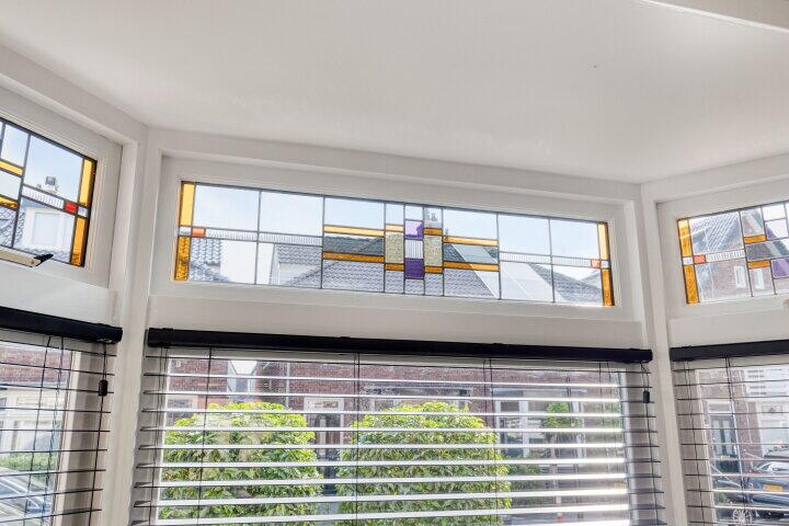 Through the front door, you enter the bright hallway with a renewed meter cupboard and a modern toilet room with wall-hung toilet and washbasin, leading into the inviting living room. The beautiful bay window with original stained-glass immediately catches the eye, providing wonderful light and an authentic atmosphere. The living room still features the original en-suite doors with stained-glass panels, allowing you to stylishly separate the living and dining areas. These classic elements give the house the charm you expect from a 1930s home.