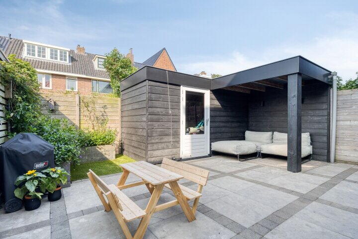 De strak aangelegde achtertuin met achterom gelegen op het zuidwesten biedt volop privacy en is voorzien van een sfeervolle overkapping, ideaal voor lange zomeravonden. Achterin de tuin bevindt zich een ruime berging, perfect voor fietsen, gereedschap of hobby’s